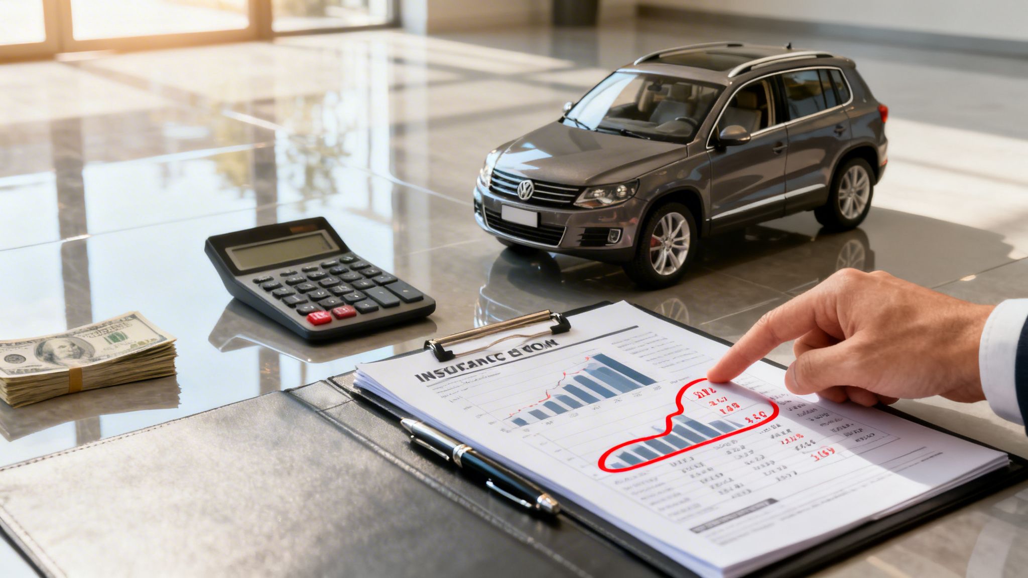 A desk with a 'Reduced Value' tag, a GEICO offer document, car keys, and a blurred silver car.